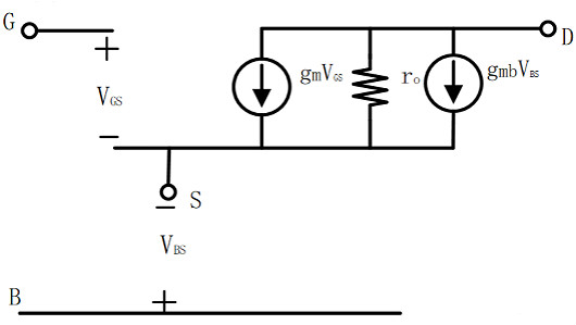 3. 考慮襯底偏置效應(yīng)(體效應(yīng)) 前面我們提到,MOSFET是一個(gè)四端器件,通常將襯底和源極相連作為三端器件使用,但是考慮體效應(yīng)時(shí),$V_{BS}$會(huì)對(duì)漏電流產(chǎn)生影響,廣義上來看,襯底起到了MOSFET另一個(gè)柵的作用,類似的用一個(gè)壓控電流源對(duì)其產(chǎn)生的影響進(jìn)行模擬,其等效模型如下圖: