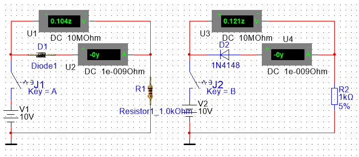 二極管加反向電壓的仿真解析二極管加反向電壓的Multisim仿真及分析斷開A、B開關閉合A、B開關先通過A、B鍵使J1、J2兩個開關打開。打開電源開